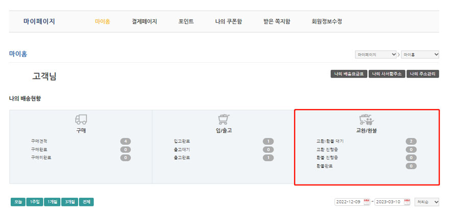 →교환/환불대기 : 교환 및 환불을 신청한 품목을 확인 할 수 있습니다.